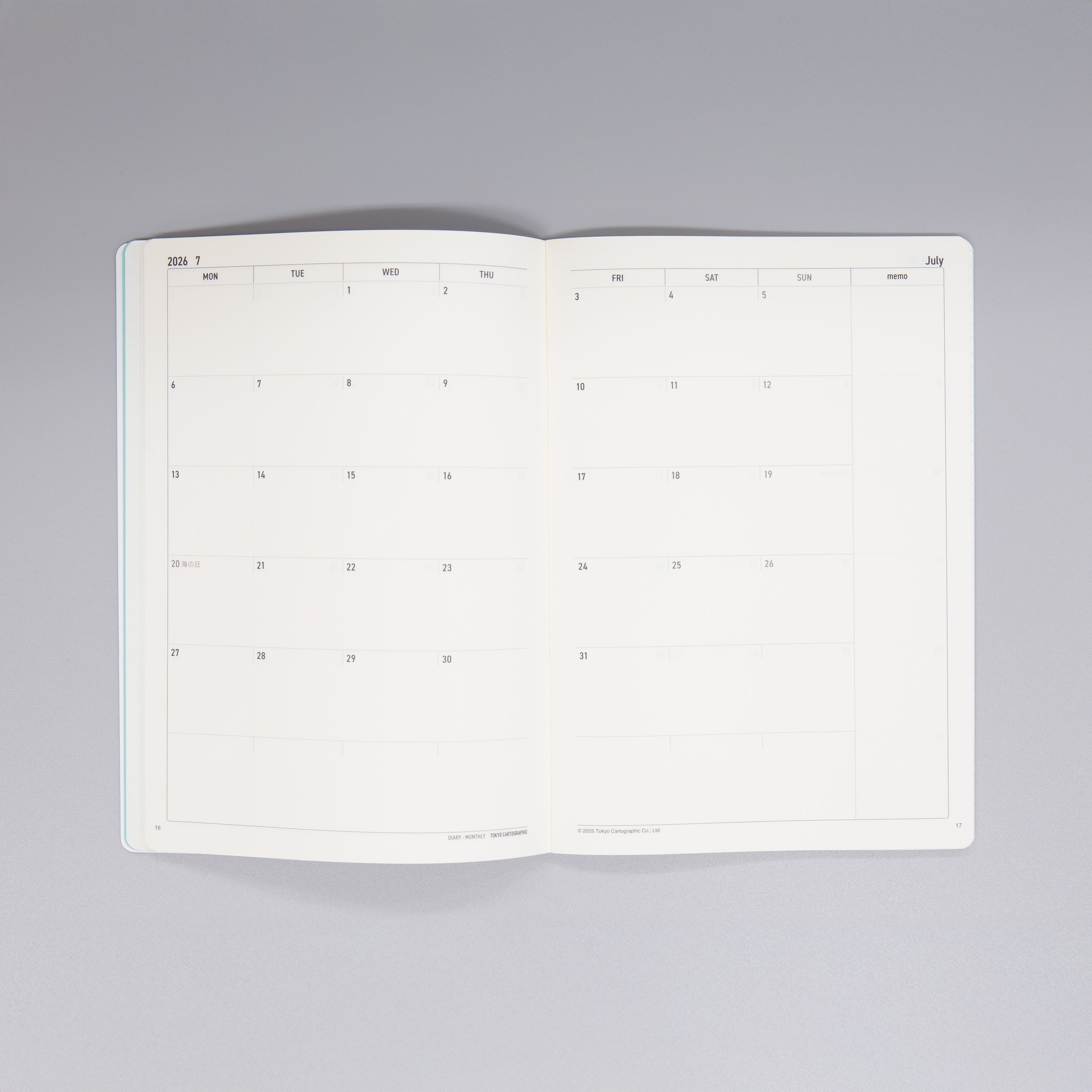 月間ダイアリーは月を全体で確認しやすい見開き1ヶ月間ブロックタイプ。ちょっとしたメモも空白に書きやすいレイアウトにしました。中紙は目に優しい薄いクリーム色を採用。