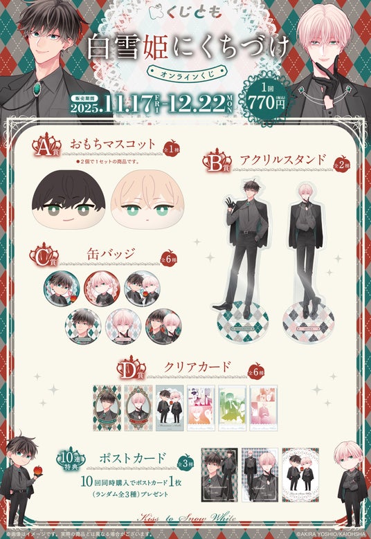 株式会社ブリッジ(本社:東京都千代田区 代表取締役社長:加藤 勝)は、運営するオンラインくじサービス「くじとも」より、GUSH COMICS『白雪姫にくちづけ』オンラインくじを、2025年11月17日(月)18時より販売します。