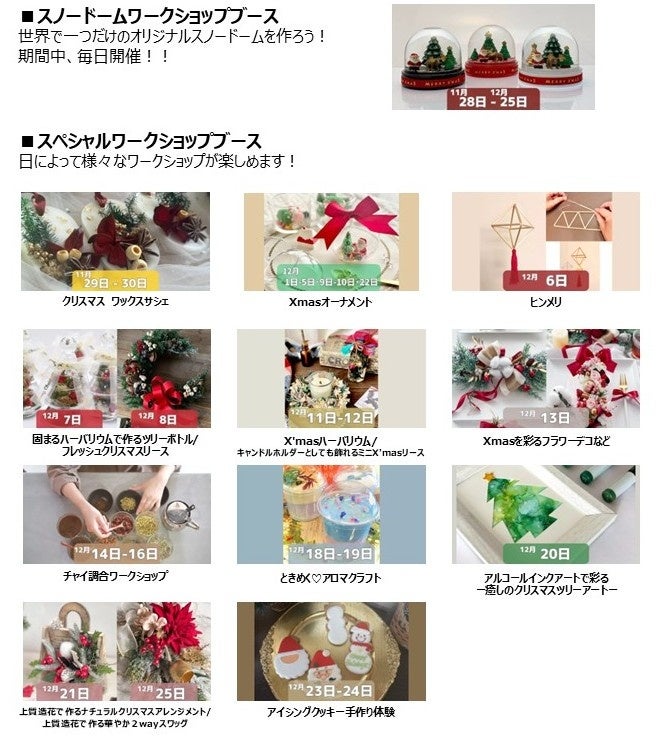 期間中、2つのブースで様々な楽しいワークショップを開催。Webからの事前予約制です。クリスマスの思い出にぜひご参加ください!