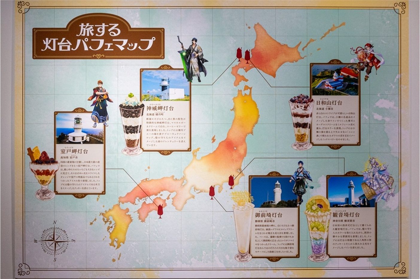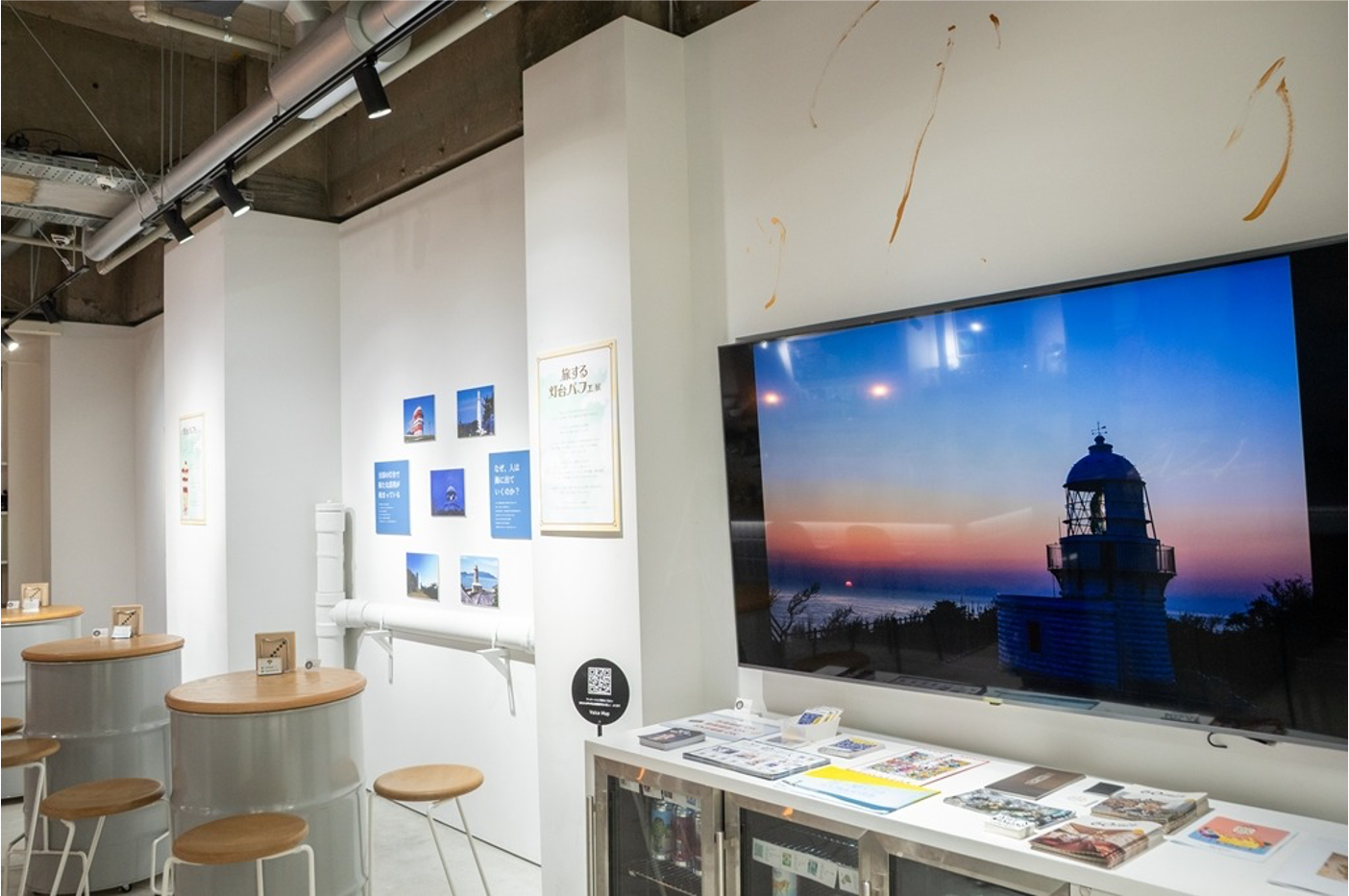 会場では、灯台パフェと連動する形で、灯台の構造や歴史、地域とのつながりを紹介する展示も実施しました。今回「灯台パフェ」として味わうことができる5基の灯台――北海道・神威岬灯台と日和山灯台、神奈川県・観音埼灯台、静岡県・御前埼灯台、高知県・室戸岬灯台――の位置関係や外観、地域性などを解説するパネルを展示し、訪れた人が灯台の物語を味わうようにたどることができるようにしました。