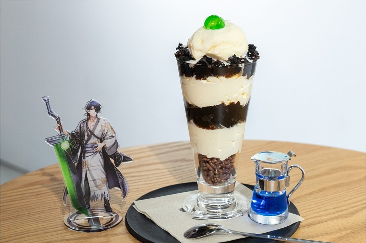 神威岬灯台パフェは、マスカルポーネクリームとコーヒーゼリーなど白と黒の食材を重ね、白黒しま模様の灯台外観を表現。シャコタンブルーと言われる美しい海の色を表現したシロップを添えました。