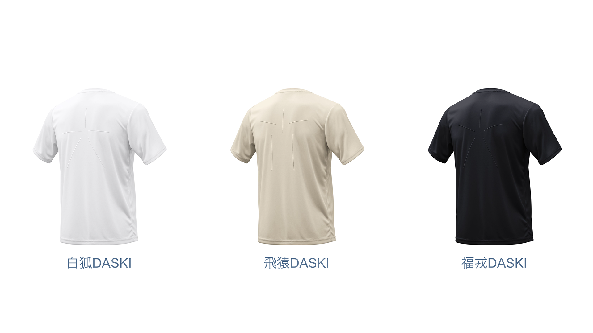 【先行発売】:「白狐DASKI」モデルの「丸首」インナーシャツから先行発売し、他の形状やモデルについて順次製造・販売を進めます。