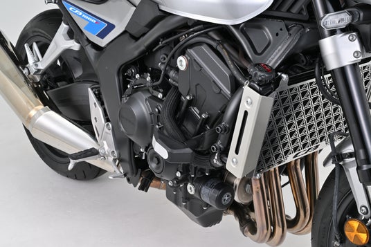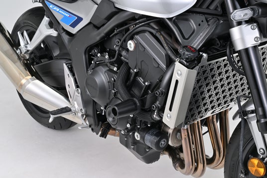 流線形の樹脂パッドが転倒時の衝撃を吸収しマシンへのダメージを緩和。アルミプレートは転倒時のボルト変形を防ぎ、機能とドレスアップを両立します。車種毎に適正な張り出し量を設定しています。左右セット。※当社エンジンガード(品番:62415)の同時装着が可能です。(意匠登録 No.D1762940)