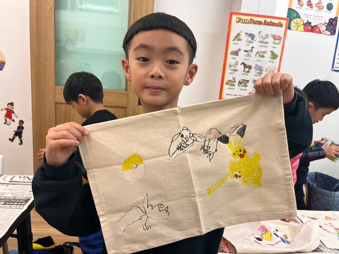 アイロンを使ってどのようにランチョンマットに絵をうつすのか、興味深々で見学していた子どもたち。自分の好みの絵を描き、個性豊かな作品を完成することができました。他の子の作品を見たり、誇らしげに自分の作品を見せてくれる姿が印象的でした。英語を学ぶだけでなく、アートを通じて創造力と自己表現力を高められた時間となりました。