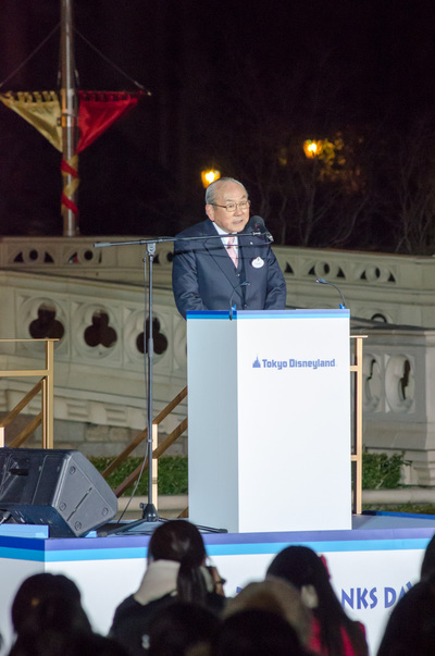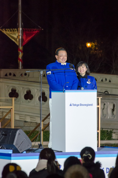 シンデレラ城前のキャッスルフォアコートでは、アンバサダーの今枝李衣奈さんの司会で、オリエンタルランド代表取締役社長(兼)COOの上西京一郎さん、代表取締役会長(兼)CEOの加賀見俊夫さんが登場。