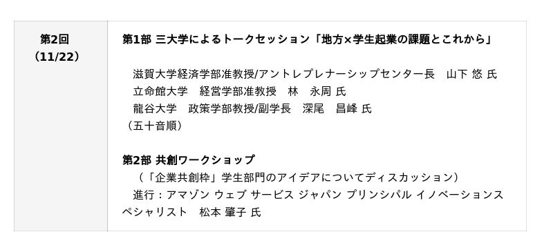 11月22日(土)の第2回では、第1部で「地方×学生起業の課題とこれから」をテーマに三大学によるトークセッション、第2部は「企業共創枠(※1)」で選定された学生のビジネスアイデアについて参加者全員でワークショップを行います。