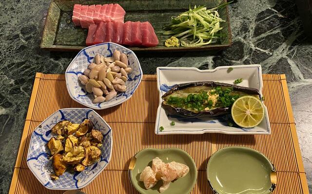 インドマグロ(中とろ)の刺身、焼きなす、焼き栗、茹で落花生。