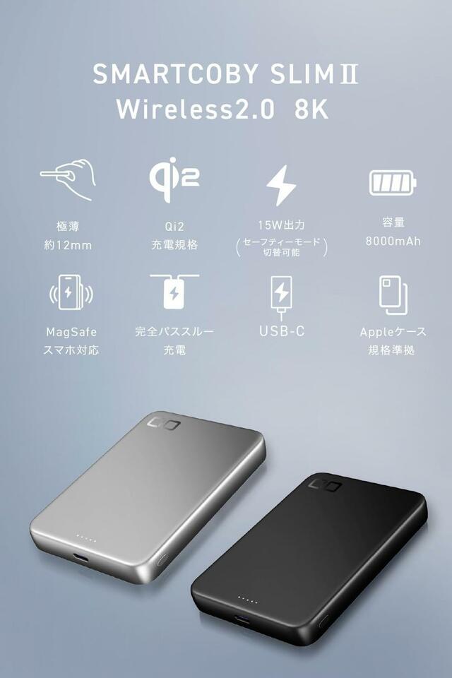 本体は薄さ約12mm、重さ約162gとコンパクトで、容量は日常使いに十分な8000mAhの「SMARTCOBY SLIMⅡ Wireless 2.0 8K」。