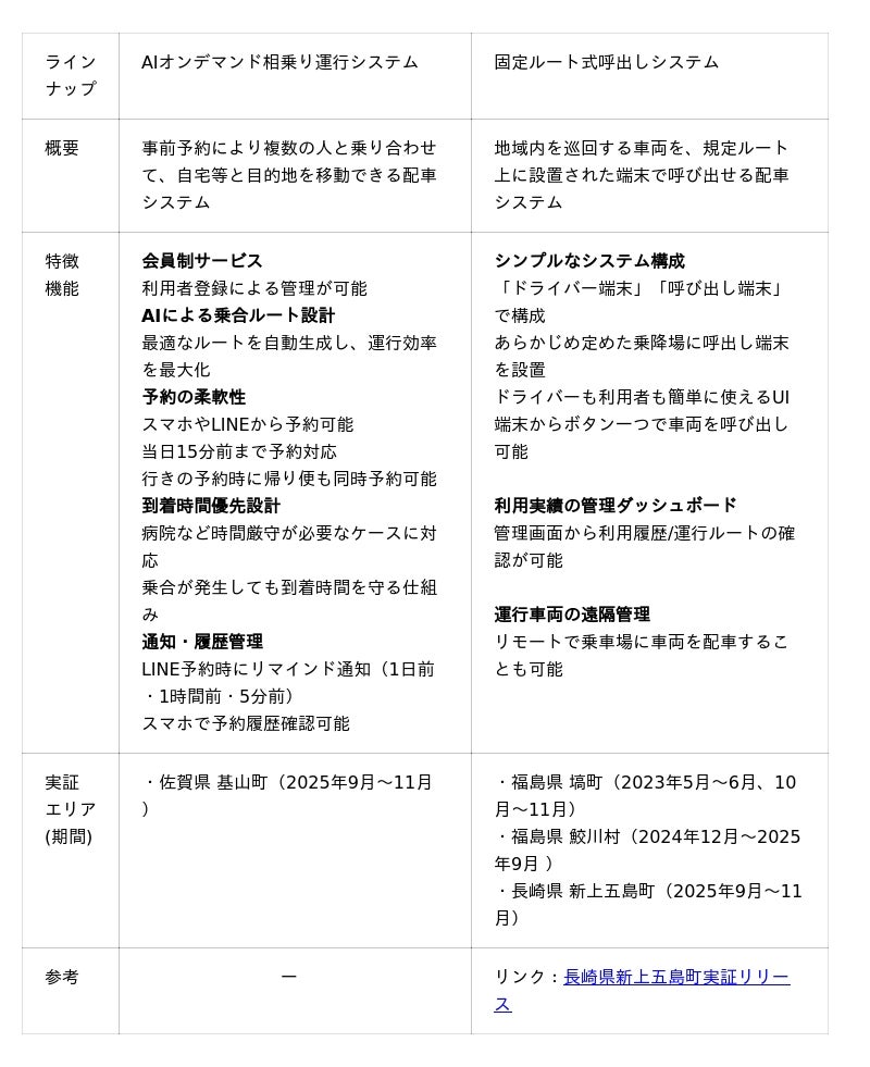 ニーズに合わせた2種類のシステムがあり、今回の基山町での実証では「AIオンデマンド相乗り運行システム」が採用されています。