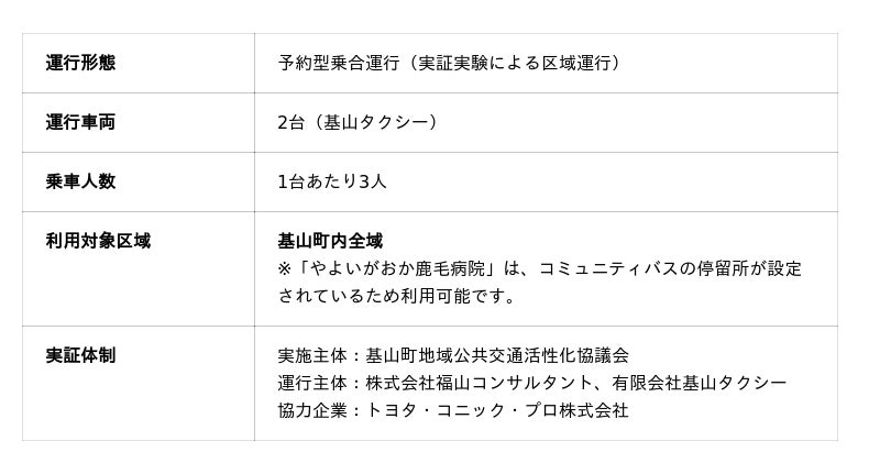 実証実験は、基山町地域公共交通活性化協議会を実施主体、有限会社基山タクシーと株式会社福山コンサルタントを運行主体、トヨタ・コニック・プロ株式会社を協力企業として実施され、