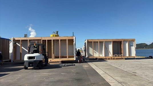 貨物船に積み込みをされるモバイル建築ユニット(提供:株式会社益田建設)