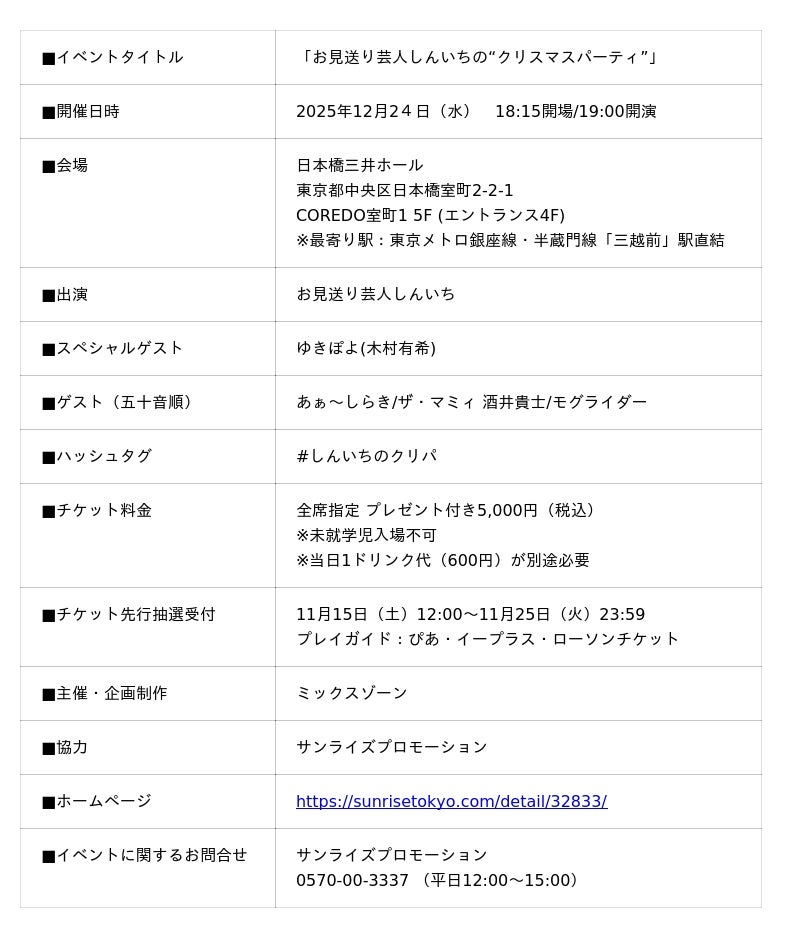 『お見送り芸人しんいちの“クリスマスパーティ”』は12/24(水)日本橋三井ホールで夜7時から開催。