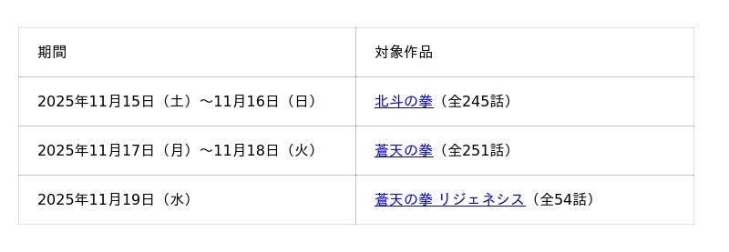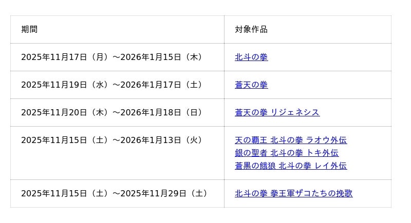 11/15(土)より「北斗シリーズ」3作品が順次全話無料!
