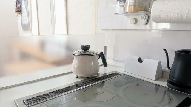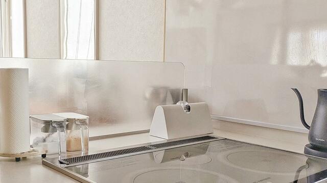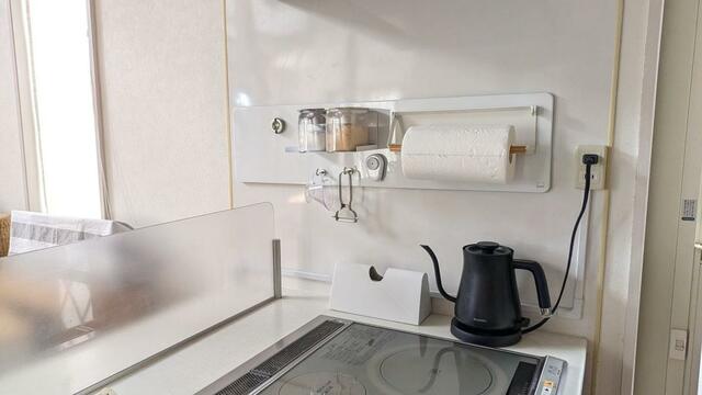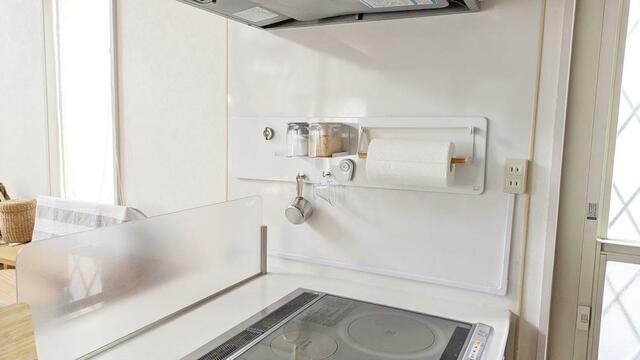 これまでIHコンロまわりに置いていた調味料とキッチンペーパーを、壁に浮かせただけでかなりスッキリ!