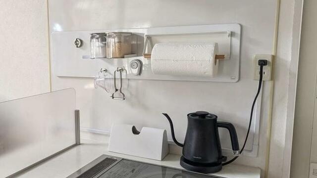 筆者宅ではまず、キッチンペーパーホルダーと調味料入れを置く棚を設置しました。