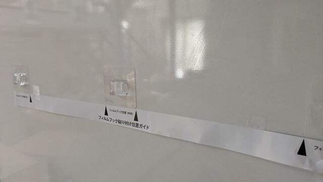 まずは同封の用紙を壁に仮止めし、印に合わせてフィルムフックを壁に3カ所付けて、