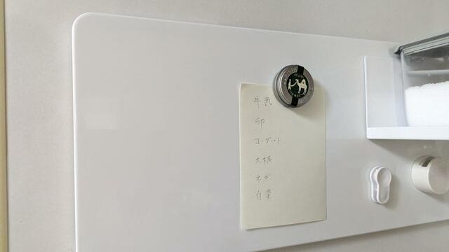 もちろんマグネットでメモやメッセージを貼ることも可能。幅の広さを活用してダイニング側からも使っています。