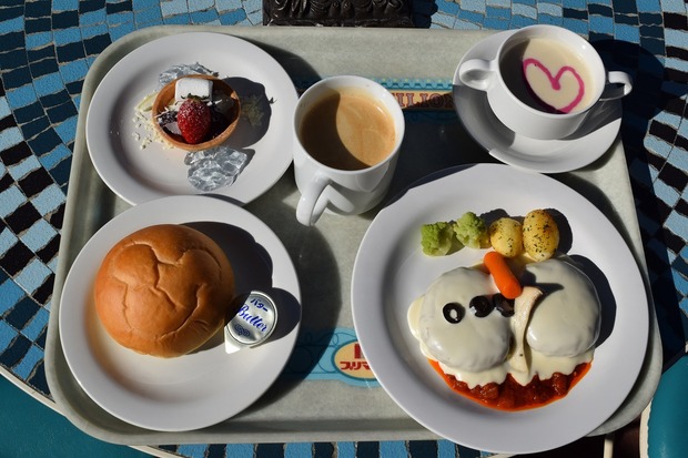 プラザパビリオン・レストラン スペシャルセットはハンバーグチーズのホワイトソース、白インゲン豆のクリームスープ、パンまたはライス、ミックスベリーとサワークリームのタルト、お飲物のチョイスで1,940円。