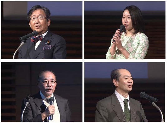 左上:那須学長開会あいさつ、右上:藤原副社長開会あいさつ、 左下:神崎教授(特任)概要説明、 右下:森研究科長閉会あいさつ