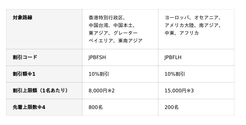 また、通常会員特典である24時間以内取消手数料無料サ-ビスは、本割引コードを使用して予約された航空券には適用されません。なお、他のキャンペーンで提供している割引がある場合、この運賃には適用されない場合があります。