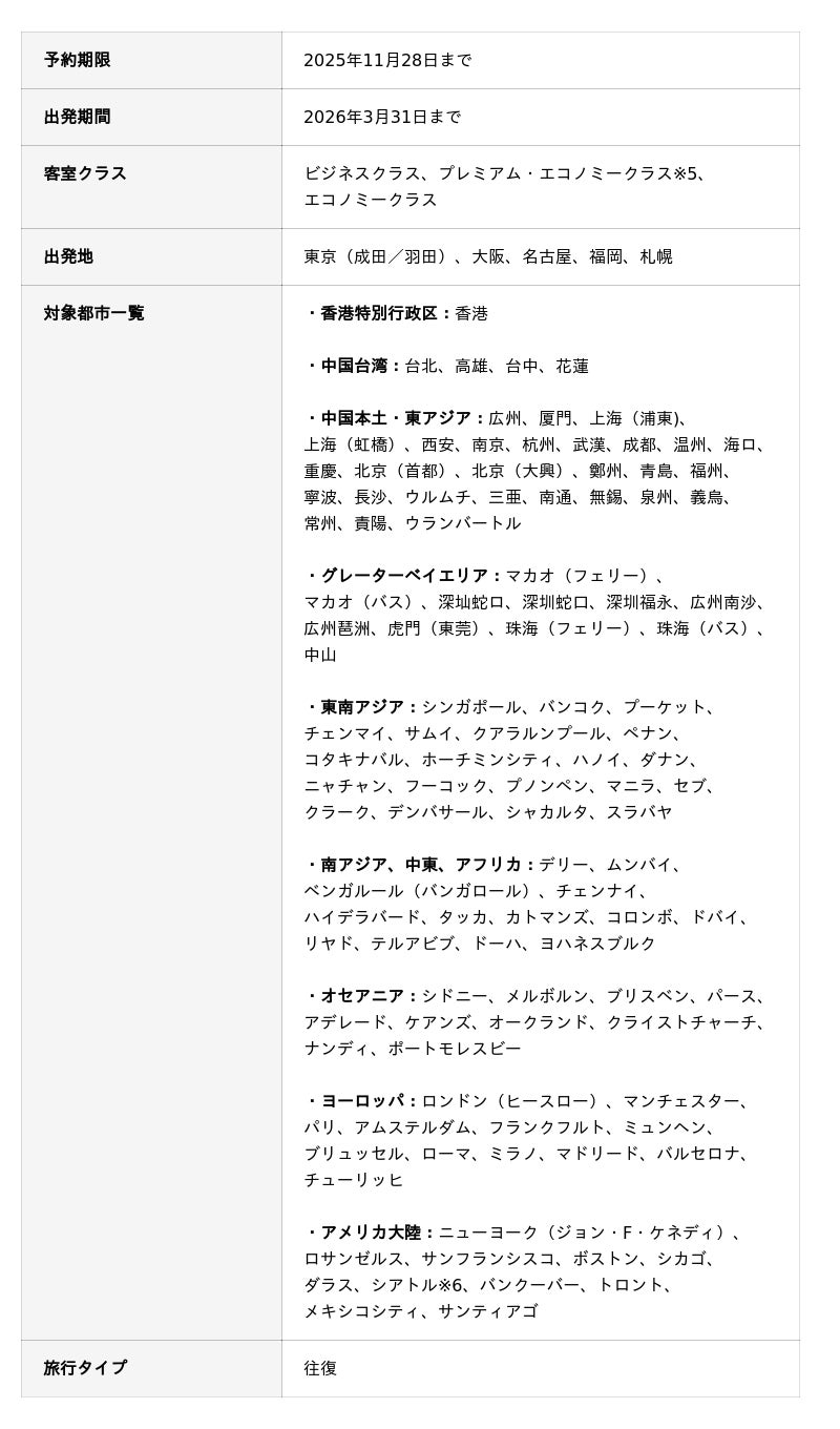 本セールは、日本からの旅行者に人気の高いアジア・ヨーロッパ・北米路線を網羅しており、年末年始の休暇や春休みのご旅行の計画に最適です。