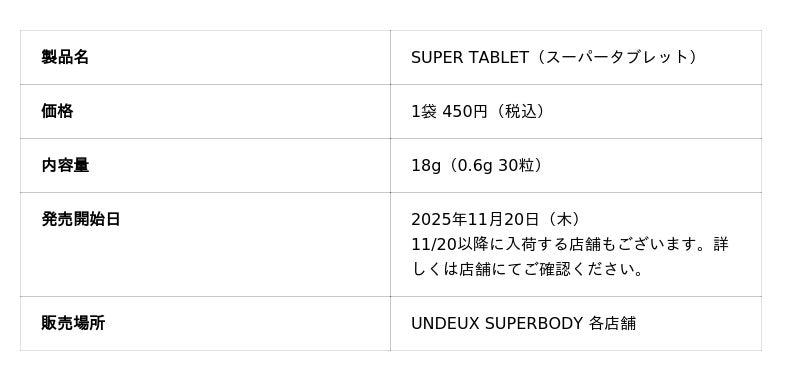 株式会社フィットクルー(本社:大阪府大阪市、代表取締役:鹿島紘樹)が展開する「UNDEUX SUPERBODY」からオリジナルサプリ「SUPER TABLET」を11/20(木)に各店舗で販売開始。