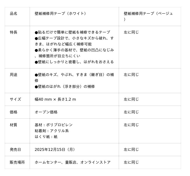 株式会社ニトムズ(本社:東京都品川区、代表取締役社長:右近敦嗣)は、貼るだけで小さなキズから壁紙の浮きやはがれ、すきまを補修でき、貼付後は補修あとが目立ちにくい「壁紙補修用テープ」を2025年12月15日(月)に発売します。