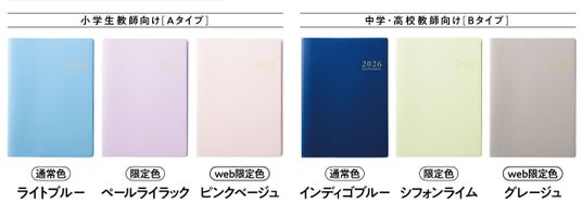 ■選ぶのが楽しい!豊富なカラーバリエーションAタイプ(小学校教師向け)とBタイプ(中学・高校教師向け)は、通常色の他に、毎年カラーが変わる「限定色」と学事出版オンラインストアでしか購入できない「web限定色」をご用意しました。お気に入りのカラーを見つけてください!