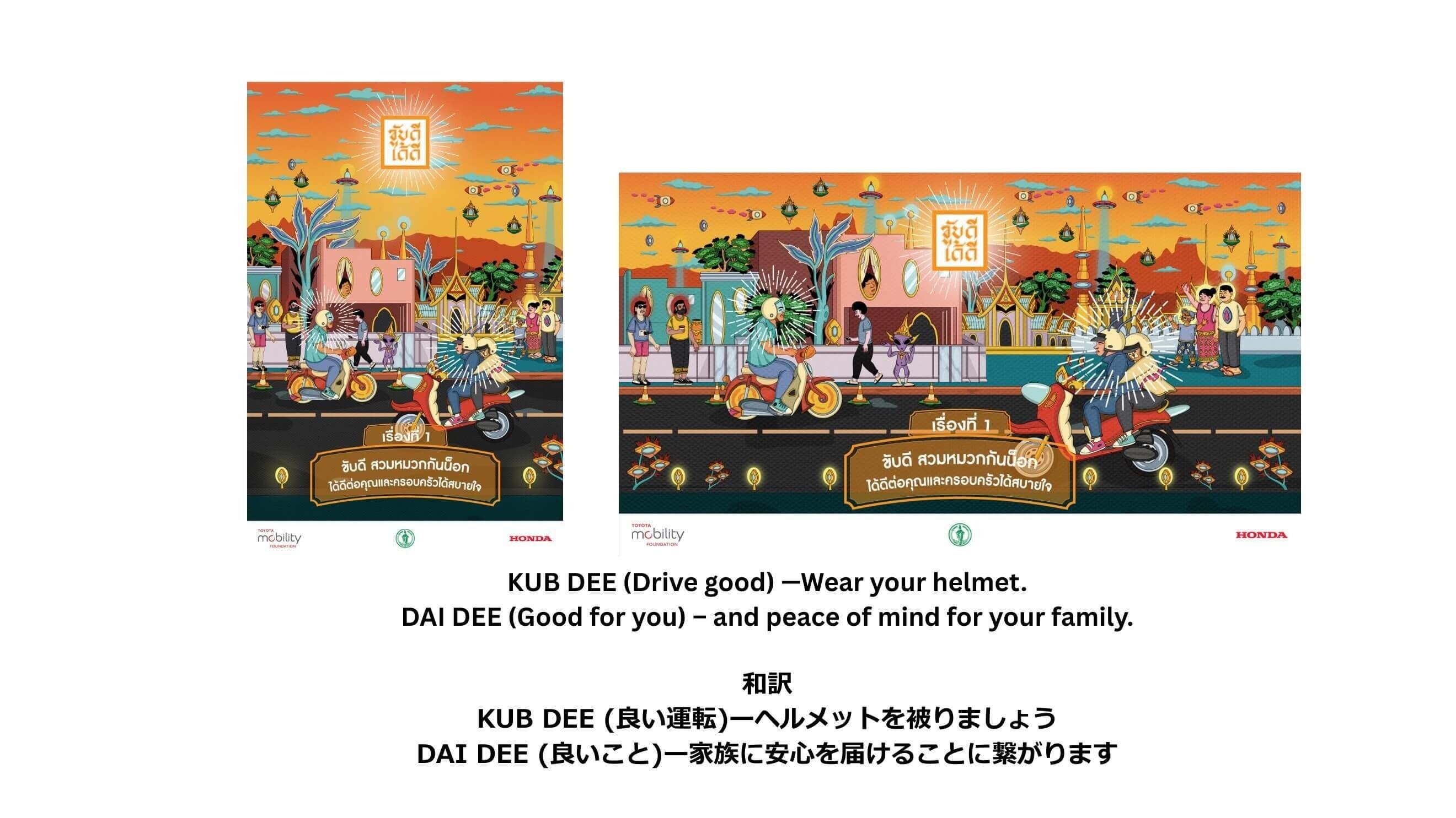 本キャンペーンは、世代を超えてタイの日常生活に深く根付いている伝統的なことわざ「TAM-DEE-DAI-DEE(良いことをすれば良いことが返ってくる)」という考え方を交通安全行動に結びつける試みです。交通安全に繋がる知識を「義務」ではなく、自分や周囲に良い影響がある「前向きな行動」として捉え直し、日常の運転行動を自然な形で安全に変えていくための仕掛けを織り込んでいます。