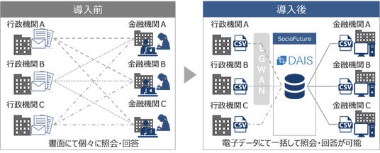 SocioFuture株式会社(東京都港区、代表取締役 社長執行員 菅原 彰彦/以下、当社)は、10月20日より、当社が展開する金融機関および行政機関向けの預貯金等照会デジタルソリューション「DAIS」(ダイス、以下、DAIS)を、株式会社かんぽ生命保険(取締役兼代表執行役社長 谷垣 邦夫/以下、「かんぽ生命保険」)に対し提供開始したことをお知らせいたします。DAISは、行政機関が財産調査等を行う際に、金融機関に対して行う預貯金等照会の回答をデジタル化するサービスです。DAISを活用することで業務のDXとセキュリティ強化を実現します。