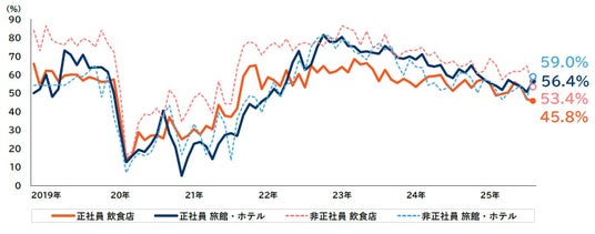 非正社員では、「旅館・ホテル」が2023年11月以来、23カ月ぶりにトップとなったが、全業種で6割を下回った。前年同月でトップの「飲食店」も改善し、DX・スポットワークの活用が生産性向上につながっているとみられる。一方で、派遣人材による活発な人員確保の動きから「人材派遣・紹介」は高水準で推移しており、「各種商品小売」とともに前年同月を上回った。