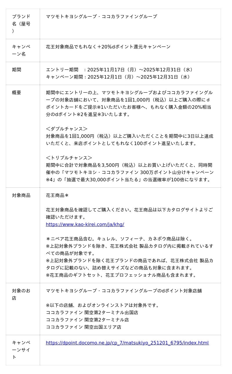 株式会社NTTドコモ(以下、ドコモ)は、全国のマツモトキヨシグループ・ココカラファイングループの対象店舗において、「花王対象商品でもれなく+20%dポイント還元キャンペーン(以下、本キャンペーン)」を2025年12月1日(月)から2025年12月31日(水)まで開催いたします。エントリー期間は2025年11月17日(月)から開始いたします。