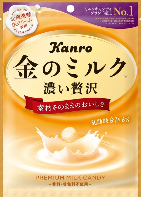 「金のミルクキャンディ」は、北海道産生クリームといった厳選素材を使用し素材の美味しさを活かして仕上げた、大人のためのプレミアムミルクキャンディです。2012年9月の発売以降、コクがありつつもあっさりとした後味などがご好評いただき、ミルクキャンディブランドNO.1の売上※を獲得しています。“まろやかな時間をつくる、やさしいひと粒”というブランドパーパスのもと、そのやさしい上質な味わいとやさしく寄り添う情緒的価値を伝えることで、より多くの方に愛され日常のちょっとしたご褒美として欠かせない一粒になることを目指しています。