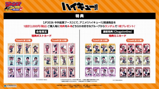 中外鉱業ブースにてアニメ「ハイキュー!!」JF2026関連商品を1会計2,000円(税込)ご購入毎に、特典ポストカードをA(全12種)・B(全12種)どちらかお好きなグループからランダムで1枚お渡しいたします!