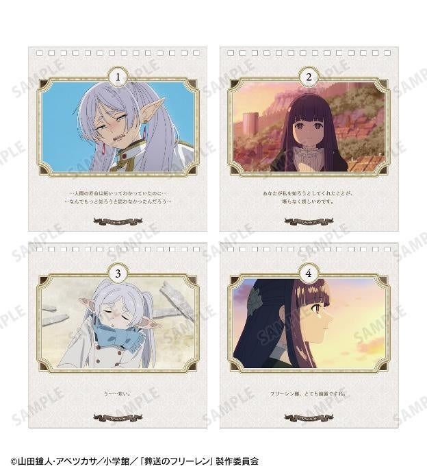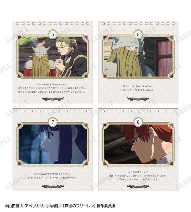 フリーレン、フェルン、シュタルク、ヒンメル、ハイター、アイゼン、ザインの印象的なシーンを日替わりでお楽しみいただける日めくりカレンダーに仕上げました。
