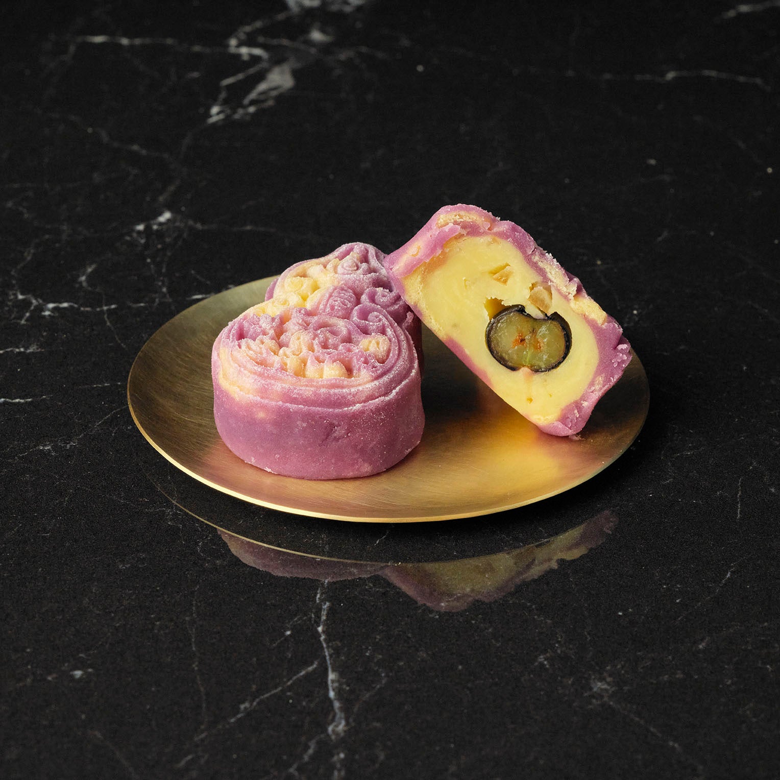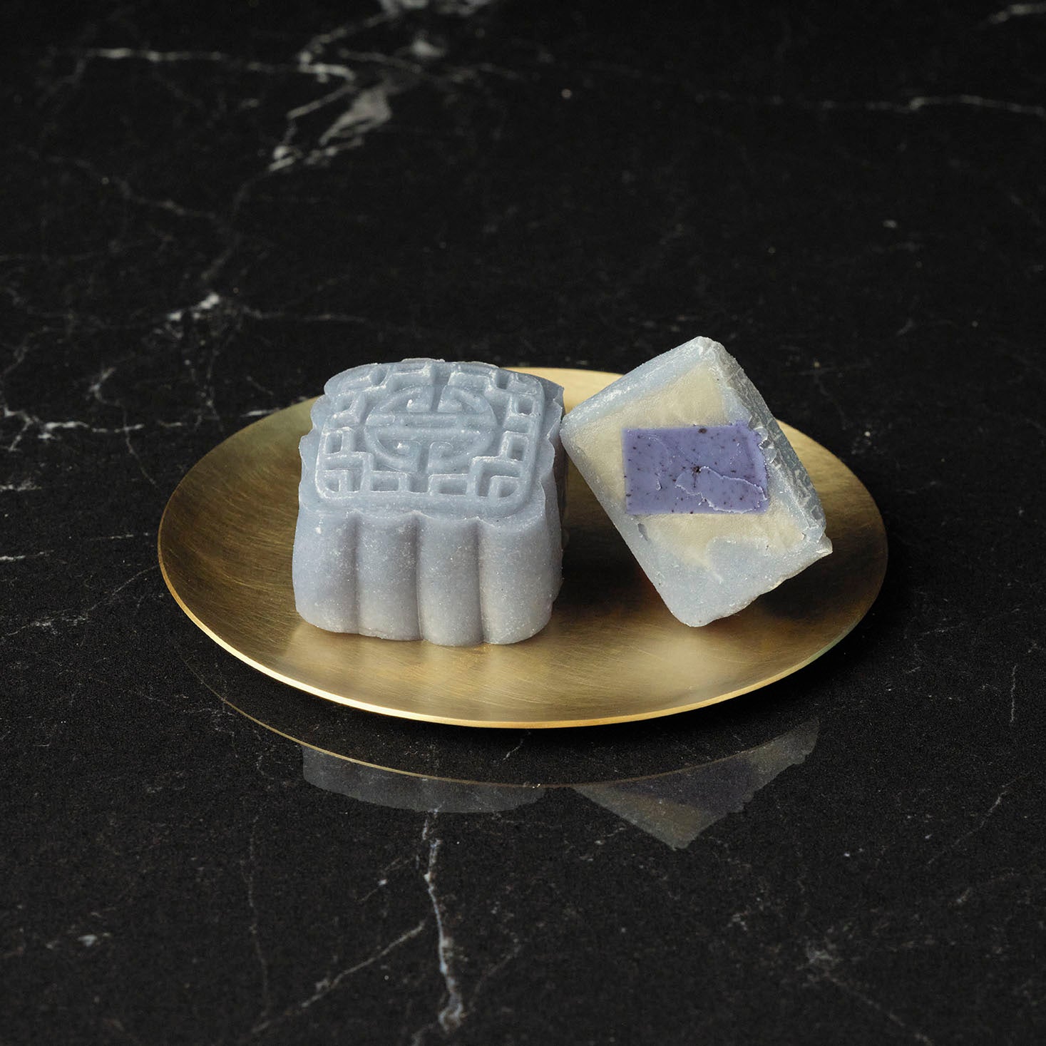 ブルーベリーをレモンピール入りのクリームチーズあんで包み込んだ緑豆ムーンケーキは、クリームチーズのコクとレモンの爽やかな酸味を楽しめます。