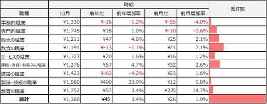 10 月のアルバイト・パートの平均時給は1,360 円(前年比45 円増、前月比26 円増)、また「バイトル」に掲載された求人件数は約362,000 件となり、前年比16.7%増、前月比3.1%増となりました。