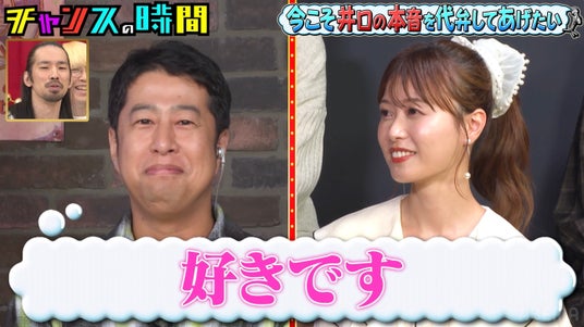 その後、井口の恋愛観を掘り下げる架空のトーク番組収録では、代弁者たちの声に流され、なぜか井口がABEMA・西澤由夏アナウンサーに告白&プロポーズをする展開に!井口の代わりに本音を代弁するはずが、 芸人たちに操られてしまう井口の困惑と対応力にスタジオでは笑いが広がりました。