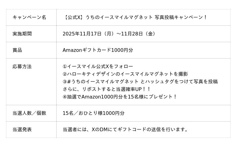 2025年11月17日(月)から11月28日(金)まで、イースマイル公式Xにて、「うちのイースマイルマグネット 写真投稿キャンペーン!」を開催いたします。