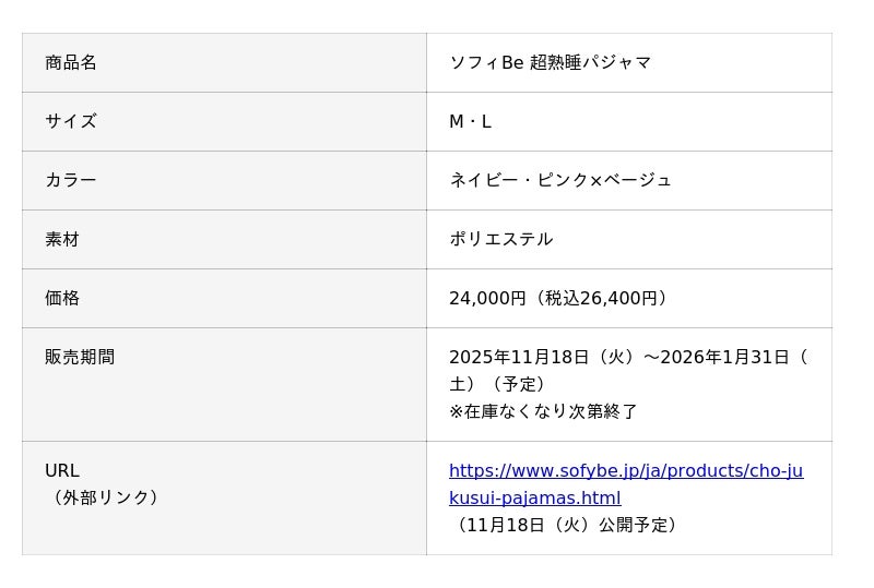 株式会社赤ちゃん本舗(本社:大阪市中央区 http://www.akachan.jp)は、ユニ・チャーム株式会社(本社:東京都港区)の女性のウェルネスケアブランド『ソフィBe(ビー)』より、“着て寝るだけ”で疲労回復をサポートするリカバリーパジャマ『ソフィBe 超熟睡パジャマ』を、2025年11月18日(火)よりアカチャンホンポ5店舗限定で期間限定販売いたします。
