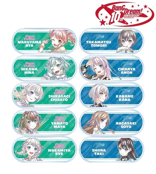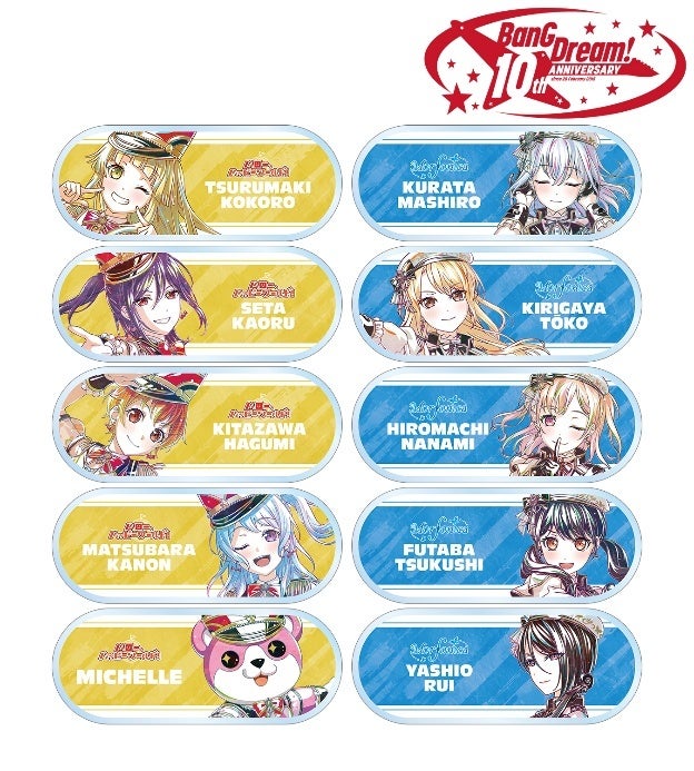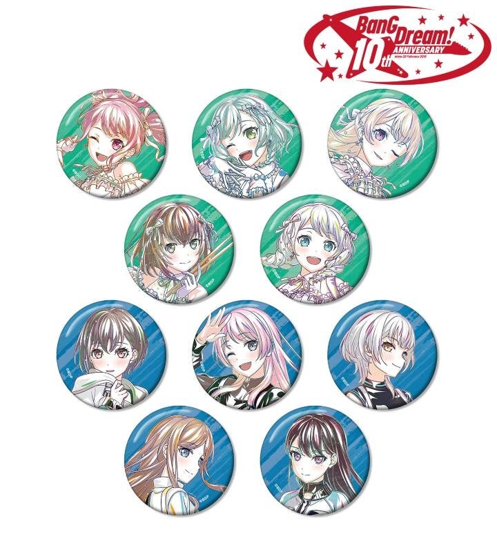 丸山 彩、氷川 日菜、白鷺 千聖、大和 麻弥、若宮 イヴ、高松 燈、千早 愛音、要 楽奈、長崎 そよ、椎名 立希のイラストを新たなタッチで魅力的に表現し、缶バッジに仕上げました。