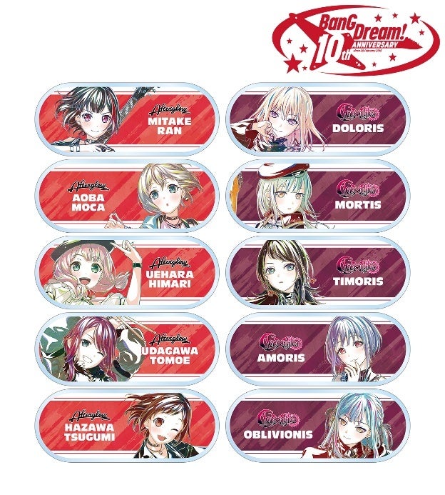 美竹 蘭、青葉 モカ、上原 ひまり、宇田川 巴、羽沢 つぐみ、ドロリス、モーティス、ティモリス、アモーリス、オブリビオニスのイラストを新たなタッチで魅力的に表現し、アクリルネームプレートに仕上げました。