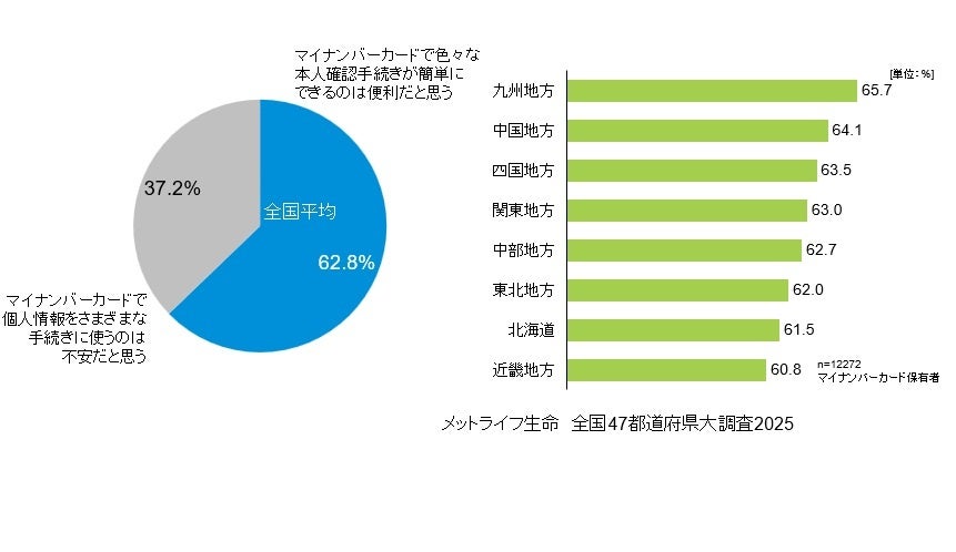 マイナンバーカードで各種本人確認が簡単にできることを便利と感じる人は62.8%に達しました。期待感の地域差はあるものの、便利と感じる人の割合は、「持ち歩き率」を上回り、今後さらに利用シーンや機能拡大への期待がうかがえます。地域別では、九州地方(65.7%)が高く、近畿地方(60.8%)はやや低めですが、全体として差は比較的小さくなっています。
