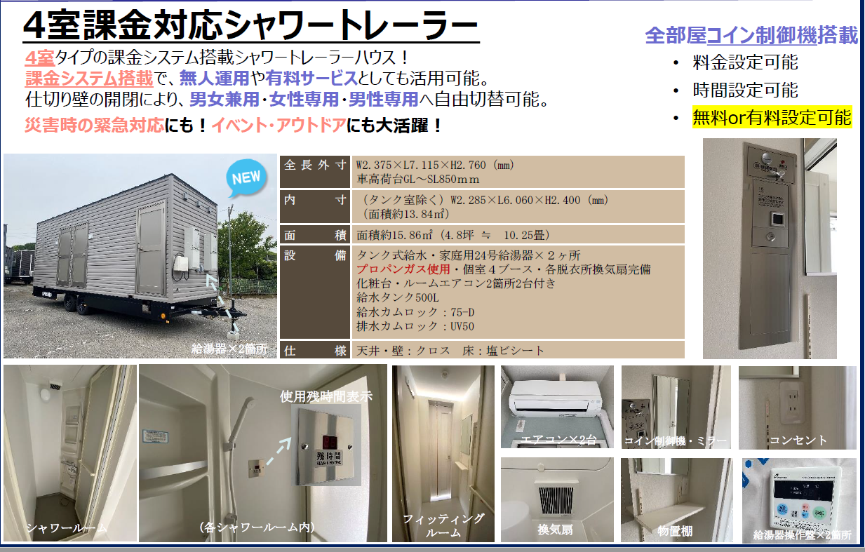 西尾レントオールは多数のトレーラーハウスを販売・レンタルしています。今回はシャワートレーラーを展示します。