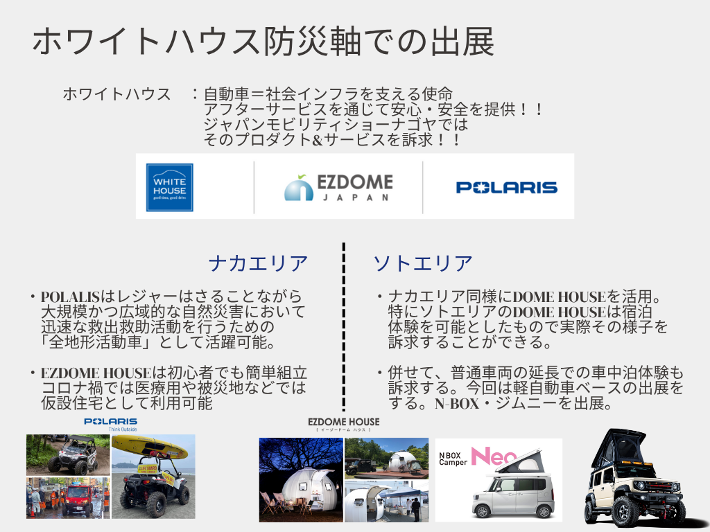 ホワイトハウスは今回は防災軸での出展。中のエリアと、モビリティビレッジでの出展となっています。