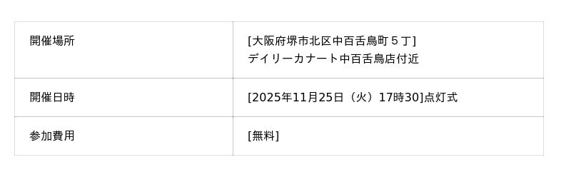 「廃油でつくる光のレシピ」中百舌鳥イルミネーション2025を2025年11月25日に開催いたします。