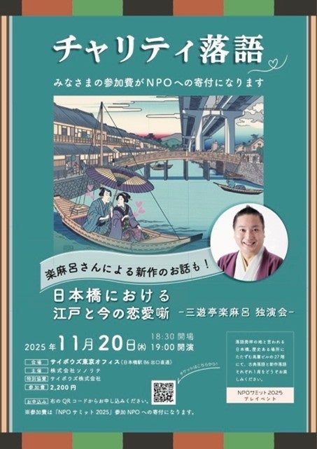会場は江戸の庶民文化の中心地であり、現代は金融・ビジネスの中心でもある日本橋。一見ミスマッチに見えるオフィスビルでの落語ですが、過去と現在の文化が交差し共鳴する瞬間を楽しんでいただきます。参加費はNPOサミット当日の寄付になります。