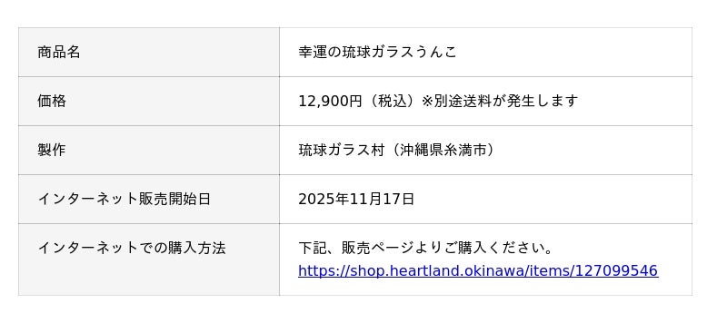 株式会社カヤック(本社:神奈川県鎌倉市、代表取締役CEO:柳澤大輔、東証グロース:3904、以下「面白法人カヤック」)と、体験型エンターテインメント施設「うんこミュージアム」を共同で展開する株式会社たのしいミュージアム(本社:東京都渋谷区、代表取締役:小林将、以下「たのしいミュージアム」)は、「うんこミュージアム OKINAWA」にて限定販売中の「幸運の琉球ガラスうんこ」(税込12,900円)を、お客様からの多くのご要望にお応えし、増産を決定。あわせてインターネットでの受注販売も開始いたします。