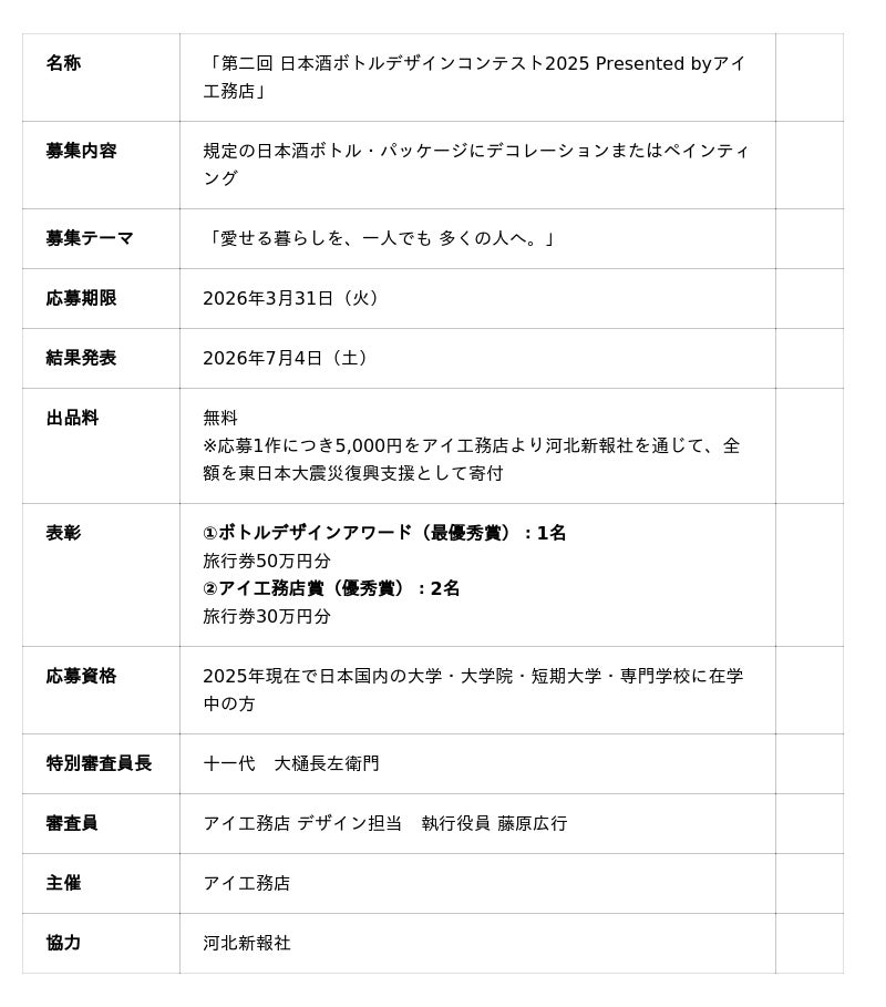今後の日本における芸術の発展および建設技術の発展を願い、アイ工務店と十一代 大樋長左衛門氏とのコラボにより2024年より開催。芸術・建設系学生の創造力の支援を目的に、日本国内の大学・専門学校に所属する学生より日本酒ボトルデザインを募集しています。2025年度のテーマは、「愛せる暮らしを、一人でも多くの人へ。」最優秀賞受賞者の出身地の地酒を選定し、天皇皇后両陛下の拝謁を仰ぐ恩賜賞・日本芸術院賞を受賞した大樋氏自ら受賞デザインをもとにオリジナルの日本酒ボトルを制作します。