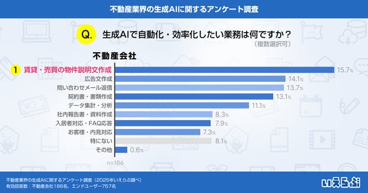 不動産会社に「生成AIで自動化・効率化したい業務は何ですか?」と質問したところ、最も多かったのは「賃貸・売買の物件説明文作成」で15.7%、次いで「広告文作成」が14.1%、「問い合わせメールへの返信」が13.7%という結果でした。